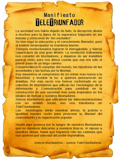 La Misión del Colectivo TeleTriunfador es promover la organización popular en la lucha por la Libertad y la Soberanía Tecnológica, haciendo uso intensivo de las Tecnologías de la Información y la comunicación como herramientas liberadoras.